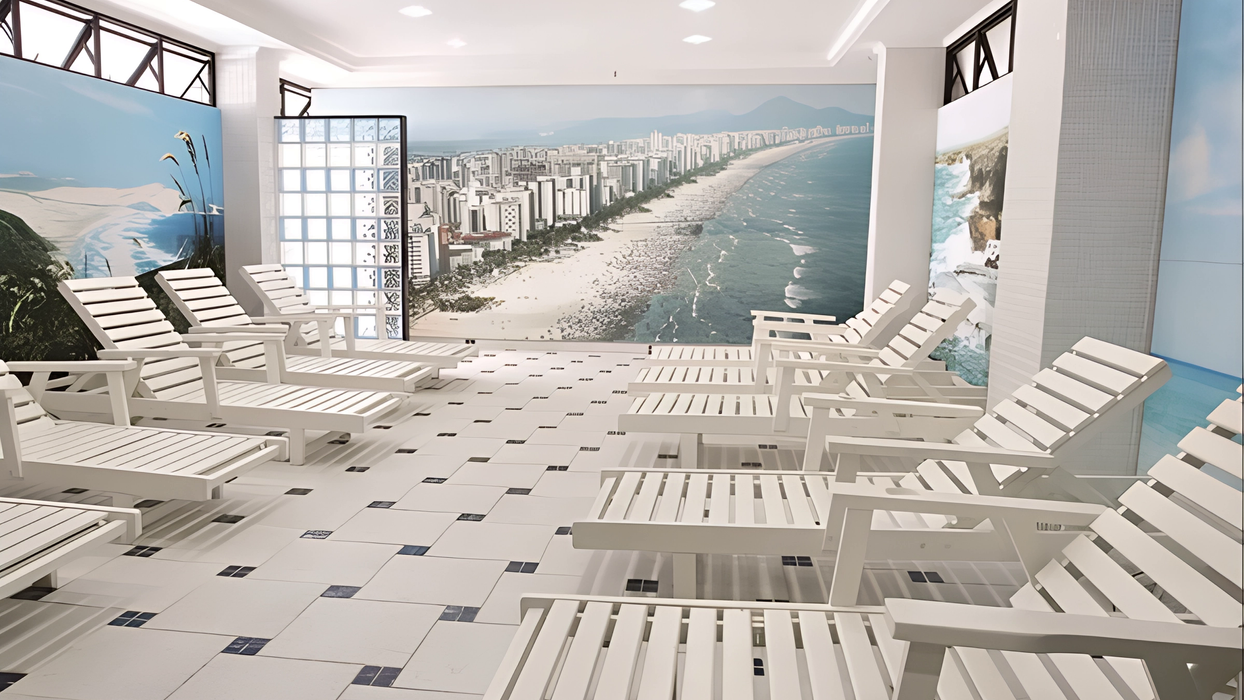 Duas piscinas uma para adultos e a outra infantil com acesso direto à lanchonete, Solarium, Sauna seca e a vapor, salão de jogos, Salão Social, Lanchonete, Área de Recreação Infantil, Cinema, Internet Móvel: sinal wireless, Academia, Fonte Luminosa.